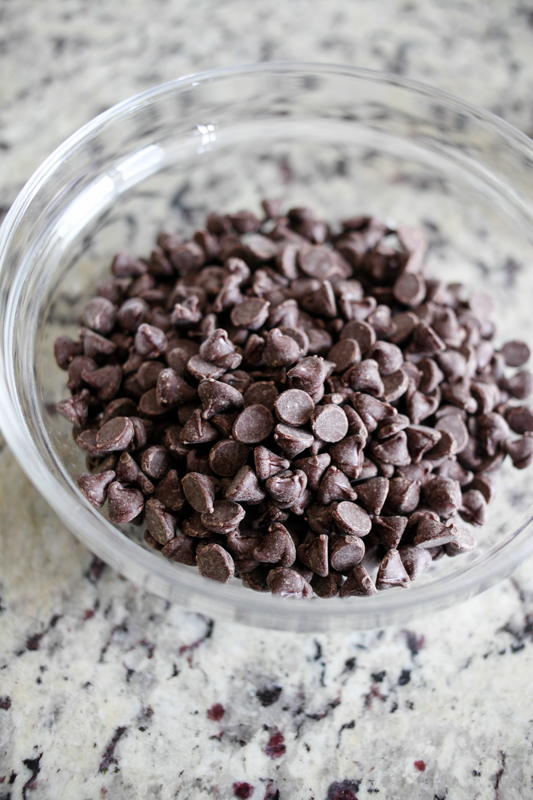 - Spoon coconut oil into a microwave-safe bowl and top with chocolate chips. Microwave in 30 second intervals on high, stirring in between. Mine took 3 rounds to melt completely.