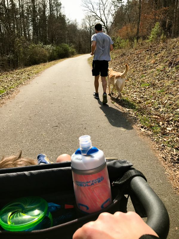 Saturday mid-day we went for a run with Thomas and Gus. Thomas and I took turns pushing the stroller, which is like 75 pounds now with such a big boy in it. Mazen gets out to run with us as much as he wants, but, to be honest, that’s not much at all. Boy gets tired fast and wants back in stat. Haha. He prefers to chill.