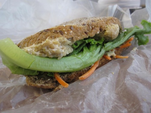 Hummus, tempeh (raw, uncooked, yes I think it’s good!), carrots, lettuce on GH bread