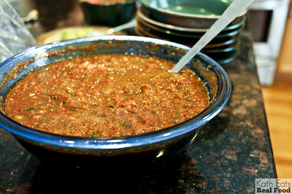 Last night we went over to our friends’ house for dinner. Emily put out a lovely spread of appetizers and we had a healthy yet gourmet meal of gazpacho and salad. It was all so refreshing after all the bacon earlier that day!