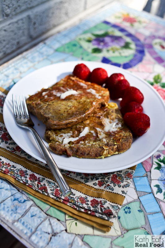This morning I fueled up with a big breakfast because I have my last two women’s league soccer games today and they start right at lunch time. I’m planning to have a small pre-game snack at noon and am hoping this whole grain Cville Crunch French toast has topped off my glycogen stores!