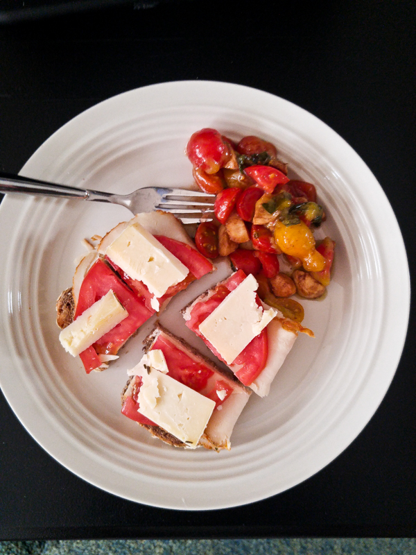 Back inside a little later we had some snacks with another episode and then made lunch – open faced sandwiches and tomato basil mozzarella salad.