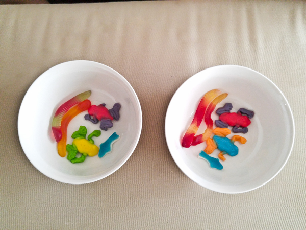 One of the challenges I planned was a food challenge. On Survivor they often have to eat really gross things like raw eggs and bugs, so I bought gummy frogs, worms and sharks and Ellen and Hillary had to see who could eat a bowl of them the fastest.