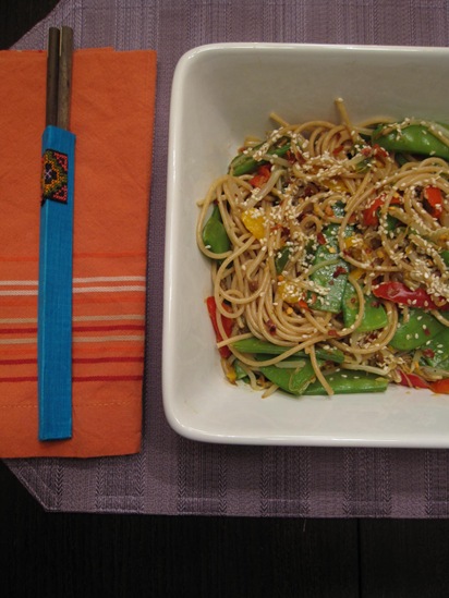 For the rest of the meal we cooked 2 servings of whole wheat spagetti and tossed that with sauteed bean sprouts, snow peas, frozen bell peppers, and 2 cloves of garlic (I didn’t want to put raw garlic in the sauce or I’d be tasting it for days). All topped with some microwave-toasted sesame seeds! We left off any meat components out of laziness/cost, but this would have been great with tofu, shrimp or chicken.