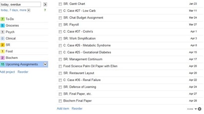 Some of you wonder how I keep track of all of my life’s tasks. I couldn’t do it without Todoist! It’s this great to-do list manager that lets you have different categories, color code, create recurring events, etc. I have a category for real “To-Do’s”, one for groceries we need, one for each course, and one for all of my assignments. Here’s my upcoming week, which compared to weeks in the past, is quite short at the moment!