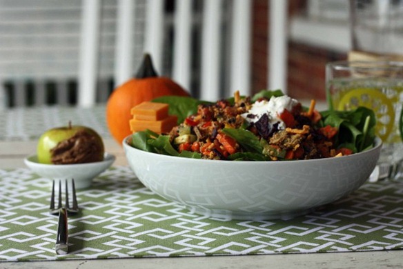 The salad was served over a big handful of baby swiss chard from our garden! I added some blue corn chip crumbles and a dollop of sour cream (the good stuff) that really made the salad. Matt said it reminded him of middle school cafeteria taco salad with the cheese and beans in there 🙂