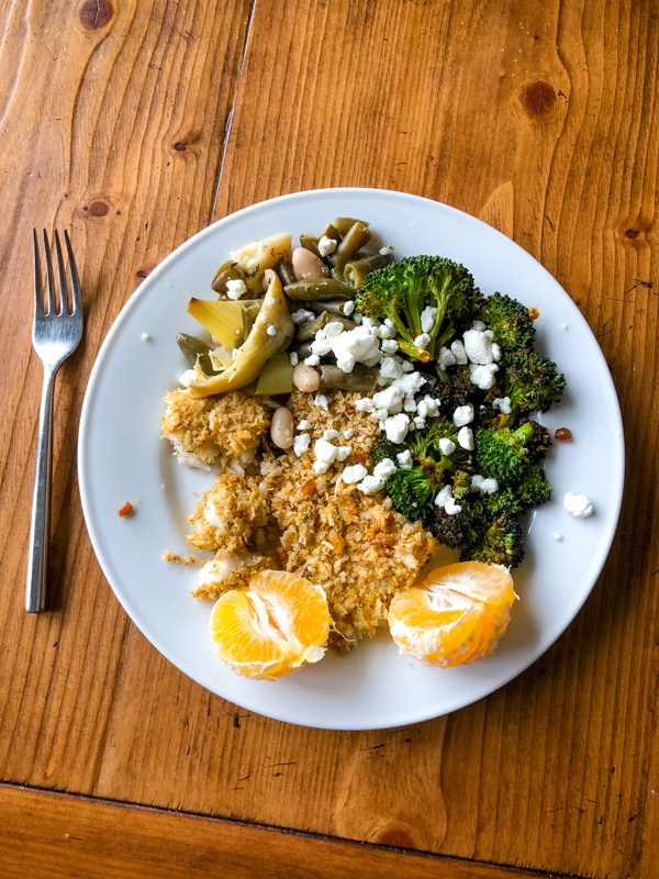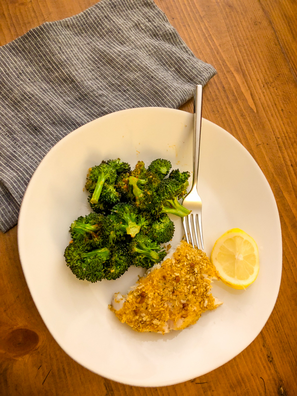 We also made a Pecan Panko-Crusted Turbot with roasted broccoli on another night. I love this pre-seasoned panko from Whole Foods. We smoothed on some Dijon mustard to help the panko stick and baked it at 400 degrees for about 12 minutes or so (I forget exactly how long it was.) The broccoli roasted alongside with smoked paprika and lemon, so we had a one-pan clean up!