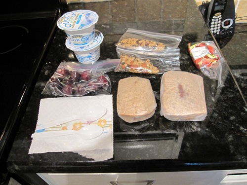 I packed this breakfast buffet last night to spread out through the morning. When I have a long period of time and/or strange, unpredictable hours when I don’t know when I will be hungry, I prefer smaller snacks to big meals. I packed two smaller breakfasts – yogurts with Mix My Granola and chia seeds and his and hers HB&BJ sandwiches (that’s HB = hazelnut butter and B = mashed banana and J= rhubarb ginger jam). Plus some cherries and a ProBar for other snacking if needed.