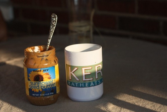 Last night I put the following into a jar with about a tablespoon +/- of TJ’s Sunflower Butter