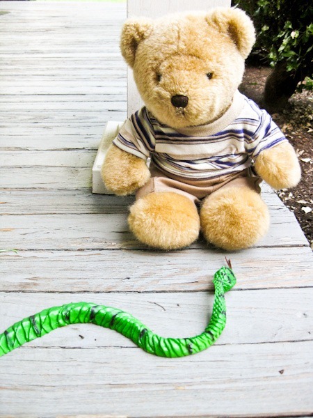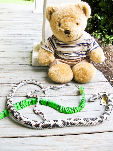 Beaker is afraid of snakes. We had a friendly garden snake in the yard two weeks ago. Beaker bolted inside. I couldn’t get him out of the house for three days. I explained that we never take chances with poisonous snakes, but that other snakes are our friends. We began by inviting just one snake over to play.