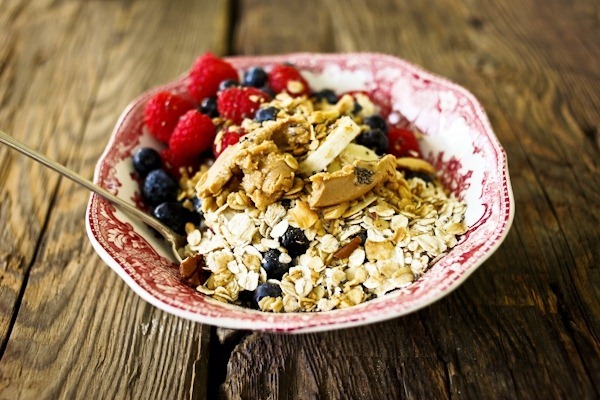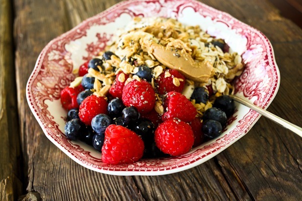 I mixed up a bowl of greek yogurt topped with berries, banana, raw oats, a sprinkle of granola and a worm of peanut butter.
