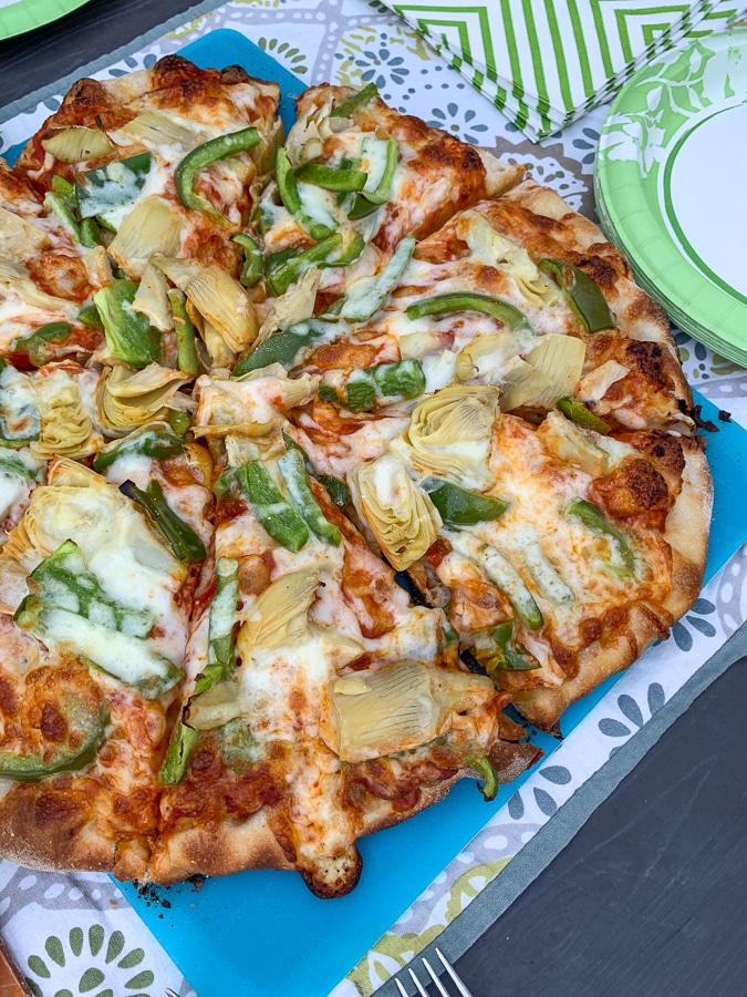 And veggie artichoke for the grownups! We use Whole Foods crust and grill this on the gas grill. Thomas has the method down!