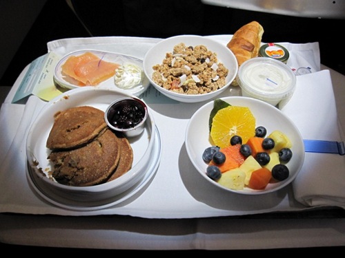 I wasn’t hungry for breakfast but it tasted so good, and I love breakfast foods. I ate about 75%. Muesli was the best I”ve ever had! Must be the Dutch airline 🙂 Gingerbread pancakes were awesome too (I have to replicate them). I wish I’d had an appetite for the smoked salmon but I just had one taste.