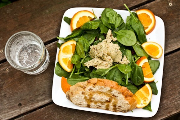 I made a half batch of Lavender Crunch Hummus and served in on literally the last fresh food in this house! The end of a container of spinach, a lone orange we got from the Montalto race 2 weekends ago, Cinnamon Chip with a dazzle of honey! [Yes, dazzle, not drizzle!]