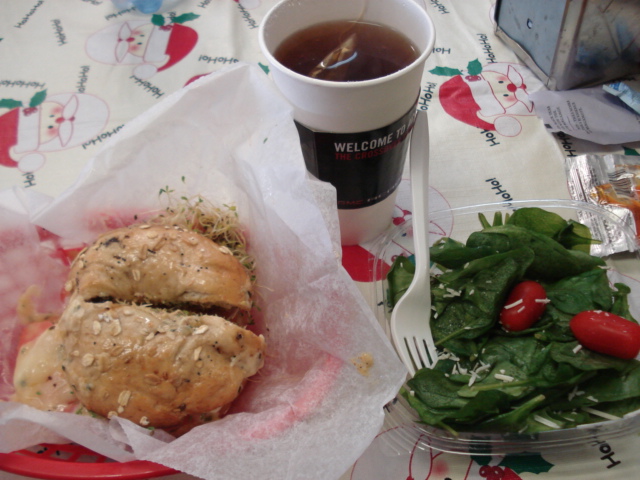 My husband’s aunt owns a bagel shop (Hot Bagel Co. for you Tennesseans) and they have GREAT bagels!!! We stopped in for lunch on the house. I ordered the vegetarian with Havarti, tomato and sprouts on an oat bagel. I also had a small spinach salad and hot tea. I wanted to only eat 3/4 of my sandwich but I went ahead and ate the whole thing. My aunt-in-law says the bagels are lower in calorie because they make them all natural and boil them, which is their signature cooking method. It was a delicious bagel, and hopefully not as high as Panera etc.’s bagels.