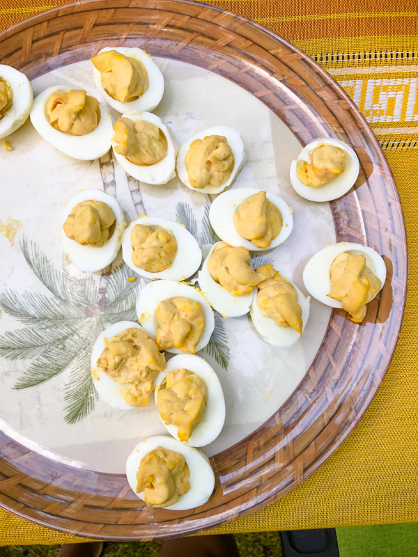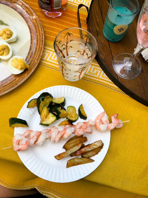 Deviled eggs, shrimp skewers, zucchini, and baked potato wedges.