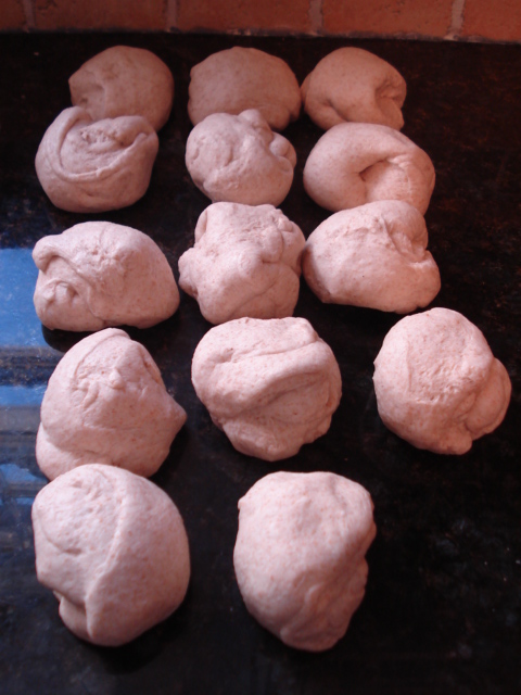 Here they are under the cloth. Notice I put very little effort into shaping them during weighing. Ideally each ball would be made of a complete piece of dough, but you and I know that it’s hard to exactly measure 3.5oz with your eyes (and just another reason to own a scale!)