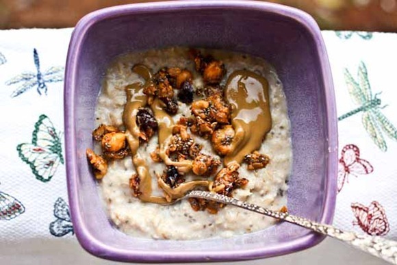 Whipped banana oats with Great Harvest Oatmeal Raisin mix, chia seeds, salt, milk, water, Chia Charger bar crumble and sunflower butter. Gooey perfection!