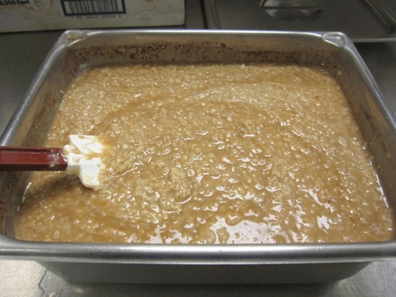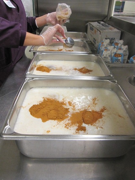 Our goal is to have some kind of oatmeal recipe on the breakfast menu rotation – and to get the kids to eat it! So today we made oatmeal foodservice-style, which meant using a kettle and a steamer and standardizing the recipe for 50+ portions and making it kitchen-staff friendly (i.e. hands OFF!)
