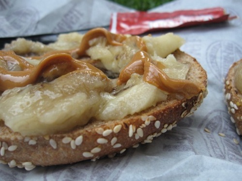 I settled on Sesame Whole Wheat and brought a banana and a Barney Butter packet as a topping. I still remember the bagel I made the same way in Chicago last year for Quaker and knew I’d be repeating the combo.