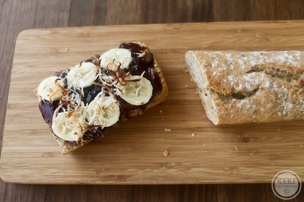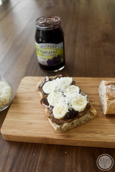 My next pairing idea was a new twist on the classic PB&J. Crusty baguette, almond butter, grape fruit spread, banana slices and shredded coconut come together in a hot + bubbly open-faced sandwich.