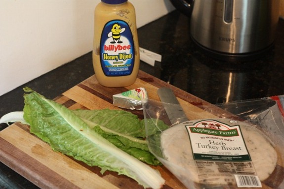 Next on the MUST-list is a moist condiment. Mustard and mayo are obvious choices, or you can get fancy with avocado, pimento cheese, or even some lightly drizzled olive oil. I went with mustard and a Laughing Cow wedge.