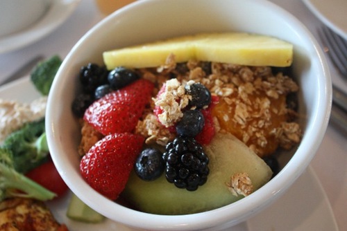 My eyes were definitely bigger than my stomach and I took some of almost everything – a roll, an omelet with peppers and cheese, smoked salmon, veggies and hummus and a bowel of fruit with some granola sprinkles.