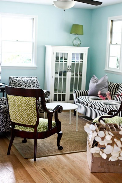I am in love with your living room! The light blue paired with the black and white furniture looks gorgeous!