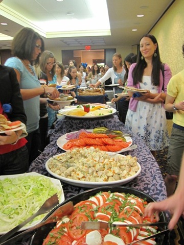 We had sandwiches with turkey and assorted cheeses, tons of veggies, grilled veggies, pesto, salad, dijon potato salad, caprese salad, and lots of fruit.
