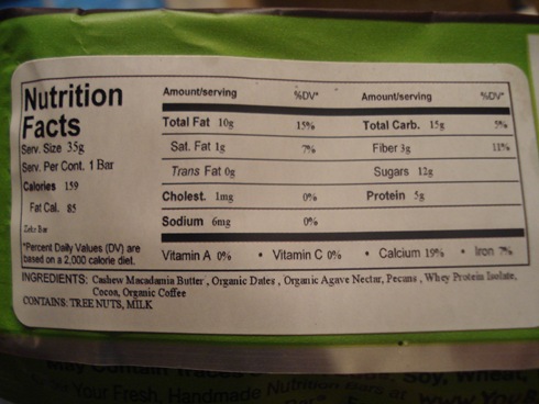 It was one of the smaller bars and contained: Cashew Macadamia Butter, Dates, Agave, Pecans, Whey Protein, Cocoa and Coffee. And it tasted just like the coffee Clif Nectar Bar, which I love!