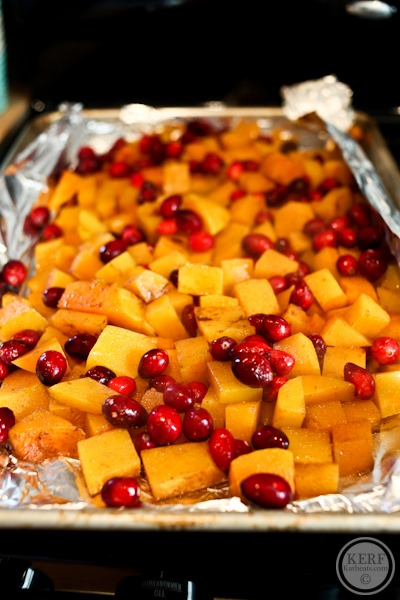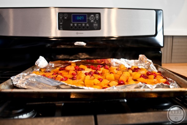 After 20 minutes, uncover and add the cranberries. Stir them around and put the whole pan back in the oven for another 15.