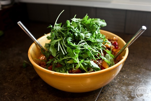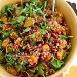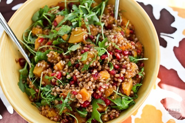Wheatberry salads are one of my favorite multipurpose dishes. Serve a wheatberry salad for breakfast (with yogurt, banana and walnuts), lunch (with sweet potatoes, black beans and salsa) or for dinner (with wild salmon, spinach and olives). Change your flavors to match the seasons as well – this version is the ultimate Fall salad and features butternut squash, cranberries, pomegranate arils and arugula with a maple-Dijon dressing.