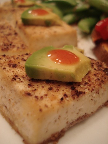 The tofu looks great. I’m not usually a big fan of tofu when it’s prepared in large pieces (as opposed to in a stir fry or whatnot), but with the avocado and hot sauce, this actually looks quite tempting.