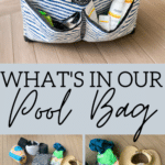 Here’s a peek into the items I keep in our pool bag to give you ideas of things to keep in your yours – so you’re always prepared and ready to splash!