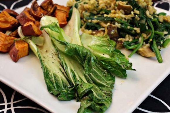 Pan-seared bok choy seasoned with garlic gold oil, salt and lots of black pepper