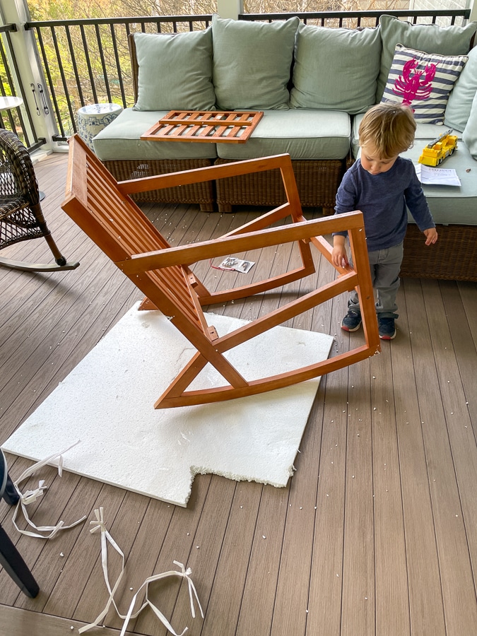 On Friday afternoon I assembled the new rocking chairs I bought for the screened porch. We wanted something with a little more cushion and a shorter profile, and we needed the former wicker rockers for more seating on the patio.