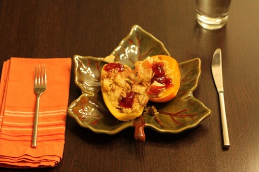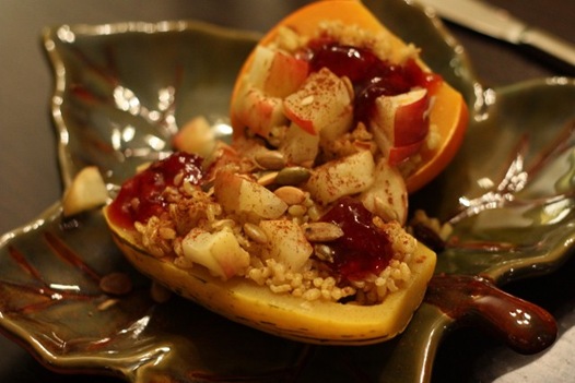 When the squash were ready, we stuffed them with the rice, some microwaved hot apple, cinnamon, pumpkin seeds and some of BethT‘s plum jam!