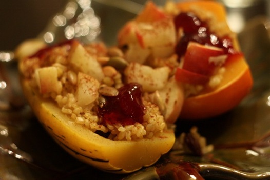 I had a similar dinner last week with an Acorn Squash and curried quinoa with golden raisins – SO YUMMY! It was my first acorn squash, and I ate the whole thing! Skin and all!