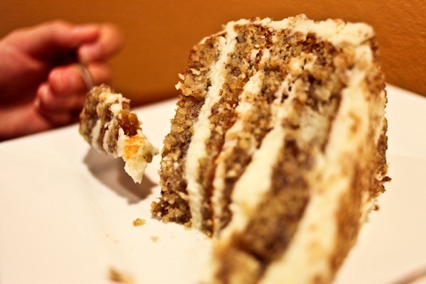 The slice was HUGE and for maybe the first time in my life, I left delicious cake uneaten. Tear! Neither one of us could fit another bite. But it was an amazing cake full of frosting, nuts and coconut!
