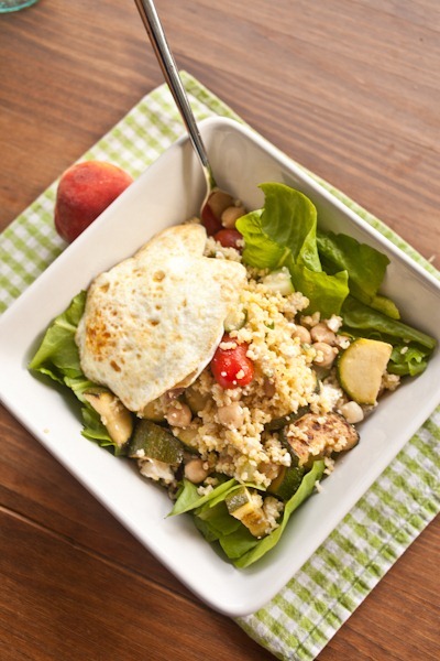 Leftover millet salad (the last!) plus garden greens and a fried egg on top