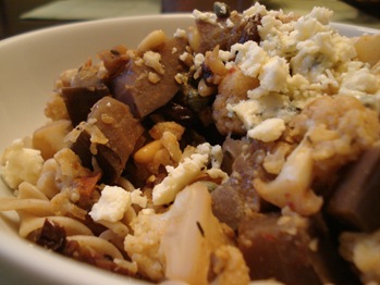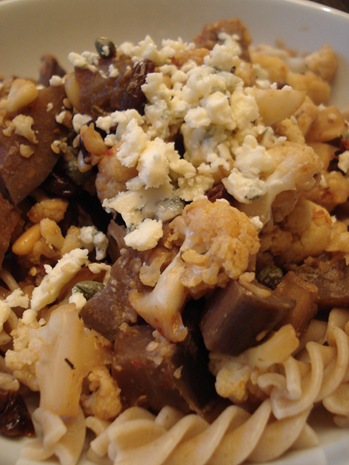 Our version cut back on the oil and herbs (that we didn’t have) and added eggplant, sun-dried tomatoes, a splash of half and half, and blue cheese. Again, the blue cheese made the dish. I’m not sure I’d recommend this recipe. I would have preferred to roast the veggies. The vinegar was a little strong and they didn’t have that golden roasted flavor that I love.