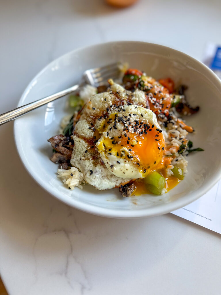 Kimchi & Vegetable Rice Bowls with Fried Eggs and Spicy Mayo