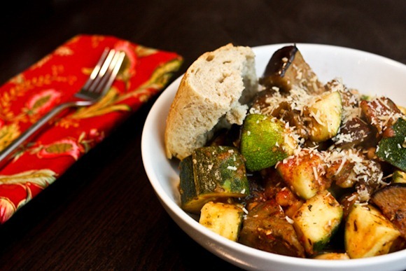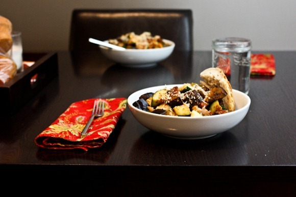I suggested an eggplant, zucchini, tomato sauce and beans cooked together into some kind of hash. He made that a delicious reality!
