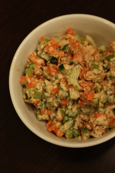 His salad was canned salmon (from Costco) with carrots, cuc, jalapeno, mustard, mayo, salt, pepper, dill and cayenne. It was great!
