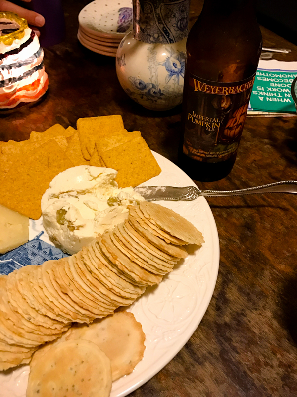 We arrived in time for dinner on Friday night. Dad and I shared two pumpkin beers, and we had cheese and crackers to start.