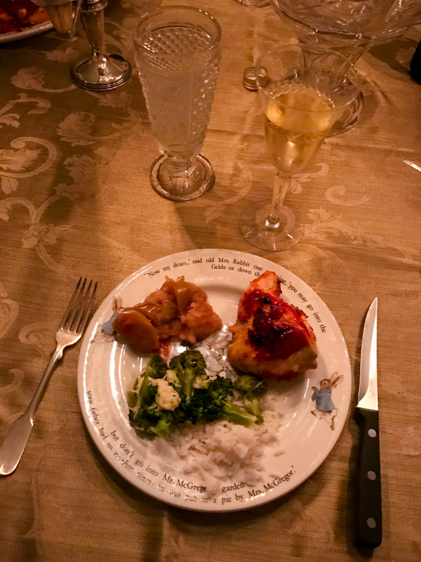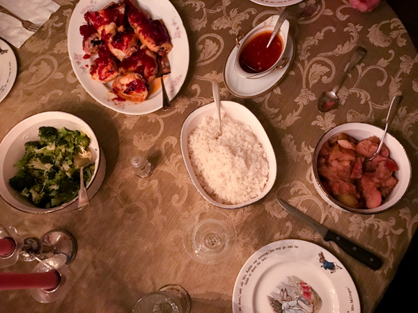 Mom made her famous BBQ chicken served with broccoli (for Mazen – it was the only thing he ate enthusiastically!), rice, and sautéed apples.