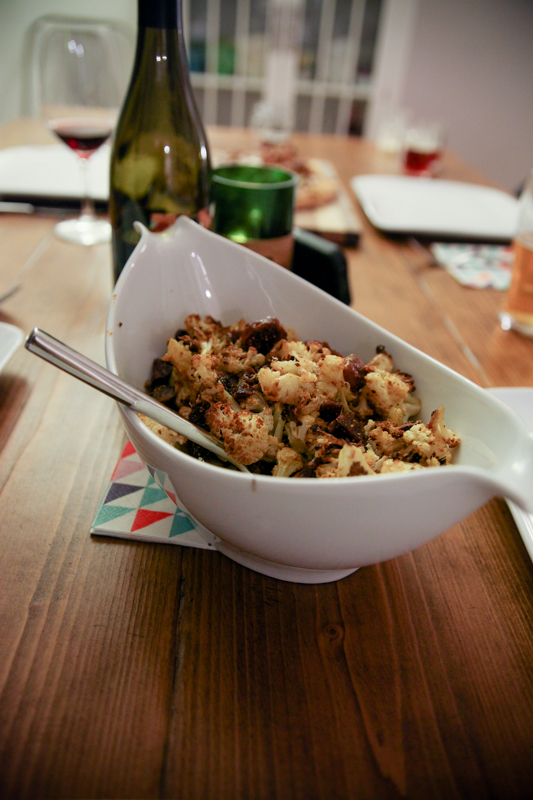 Friday night we had a few friends over for casual pizza night. I roasted some cauliflower with curry powder and figs as a nice alternative to a green salad. We sipped lots of wine too and ate dark chocolate for dessert!
