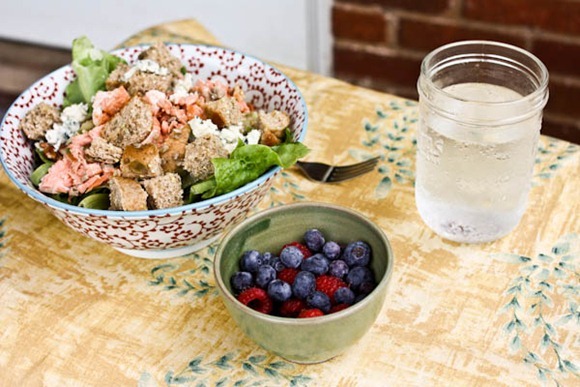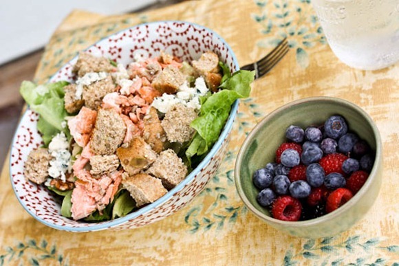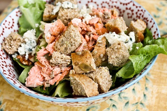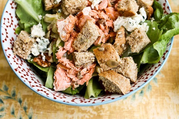 Garden lettuce, spinach, slaw, salmon, maytag blue cheese (not my favorite..), Dakota bread croutons – lots to munch!