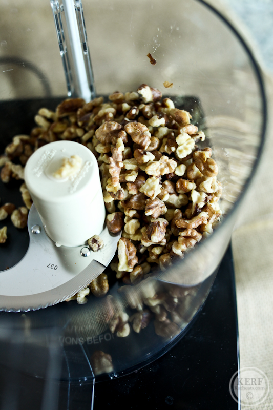 When the walnuts are done, add them to the food processor.