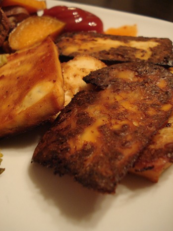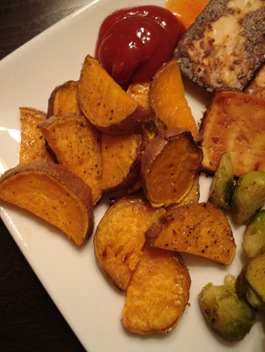 Dinner tonight was a roast fest: tofu, sweet potato + brussels sprouts. I had planned a sweet potato + cranberry hash recipe, but when I looked at it it called for all these complicated steps and I didn’t have the energy. So I just put all of the below in the oven at 400* for about 35 minutes. The SP + BS got olive oil and salt and the tofu got a rub with Bone Suckin’ Sauce.
